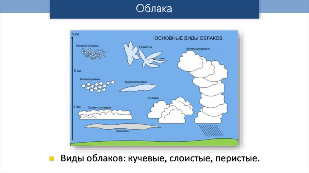 ОблакаВиды облаков: кучевые, слоистые, перистые.