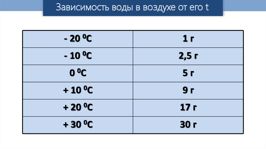 Зависимость воды в воздухе от его t- 20 0С