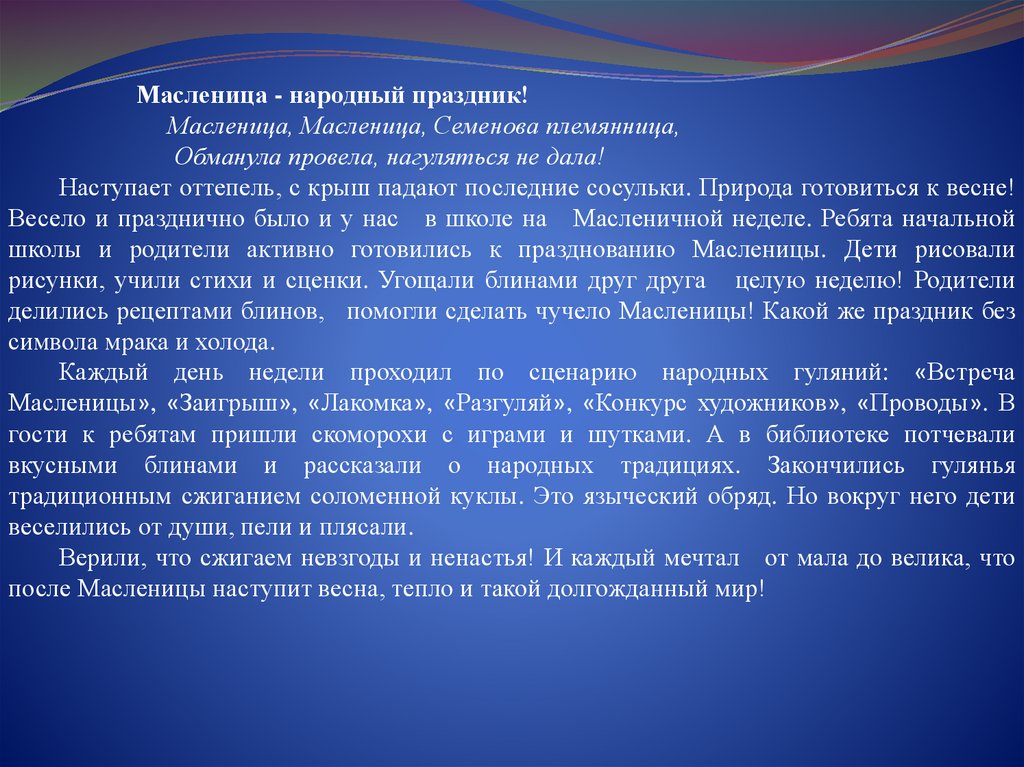 рисунки, учили стихи и сценки. Угощали блинами друг друга целую неделю! Родители