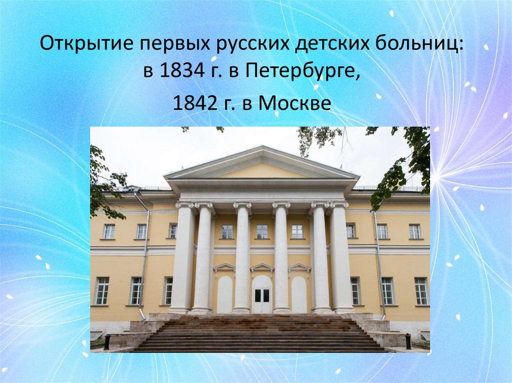 Открытие первых русских детских больниц:в 1834 г. в Петербурге,