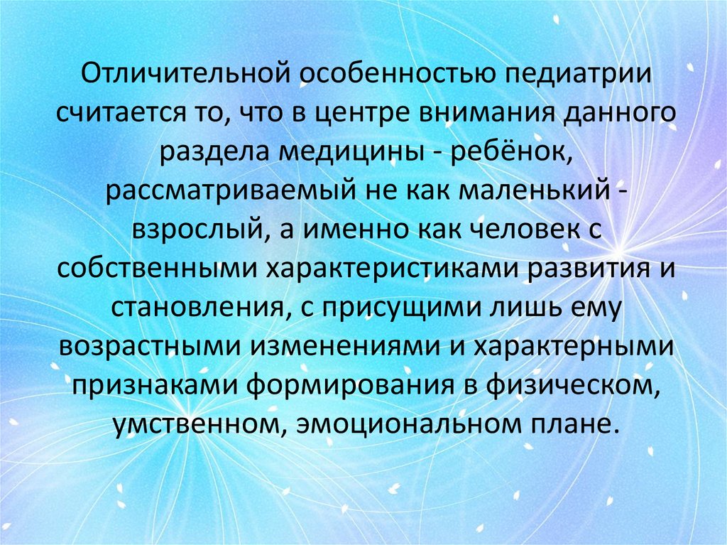 Отличительной особенностью педиатриисчитается то, что в центре внимания данного