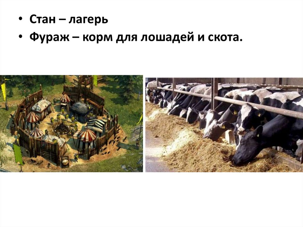 • Стан – лагерь• Фураж – корм для лошадей и скота.