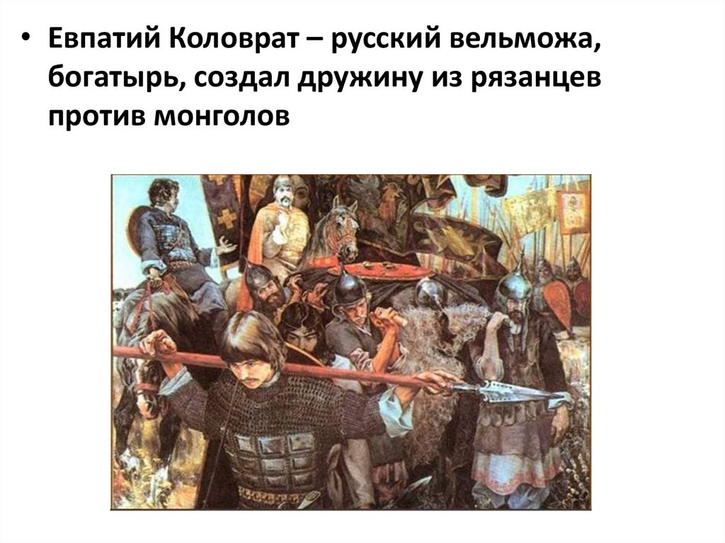 • Евпатий Коловрат – русский вельможа,богатырь, создал дружину из рязанцев