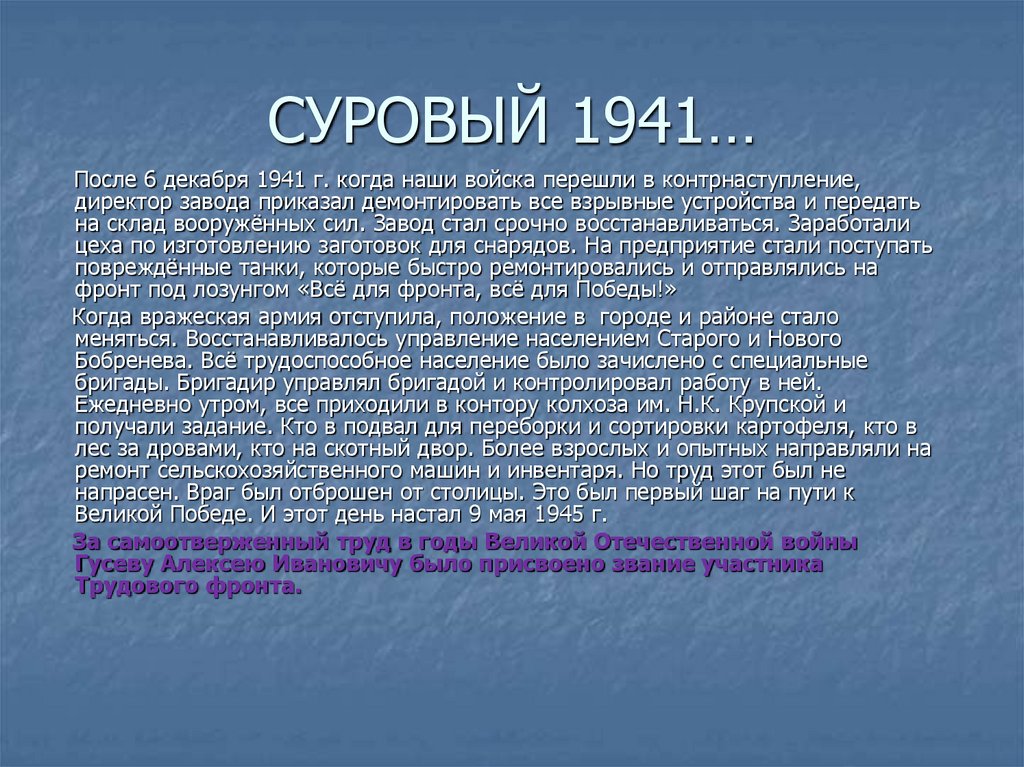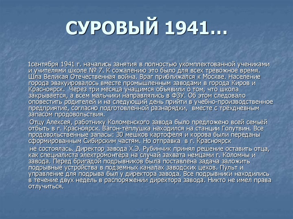 СУРОВЫЙ 1941…1сентября 1941 г. начались занятия в полностью укомплектованной учениками