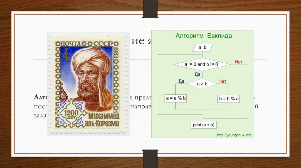 Понятие алгоритмаАлгоритм – точное и понятное предписание исполнителю совершить