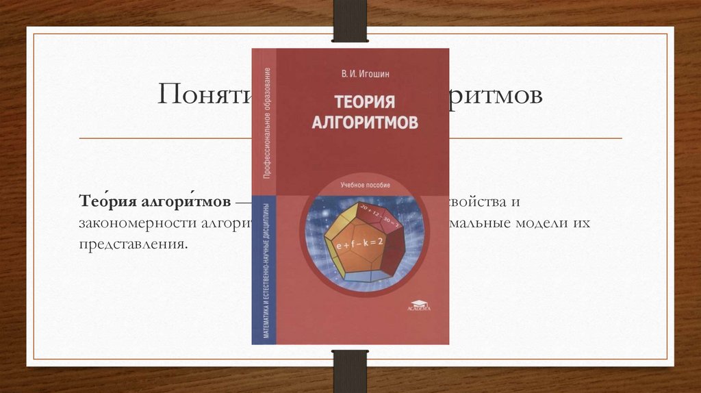 Понятие Теории алгоритмовТео́рия алгори́тмов — наука, изучающая общие свойства и