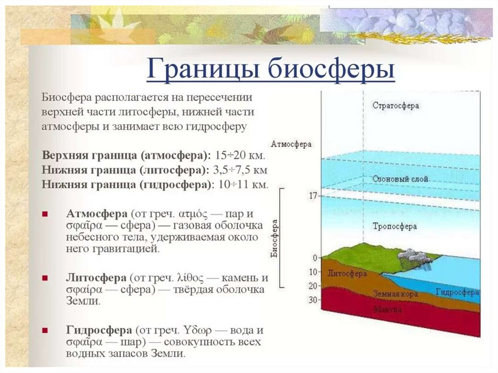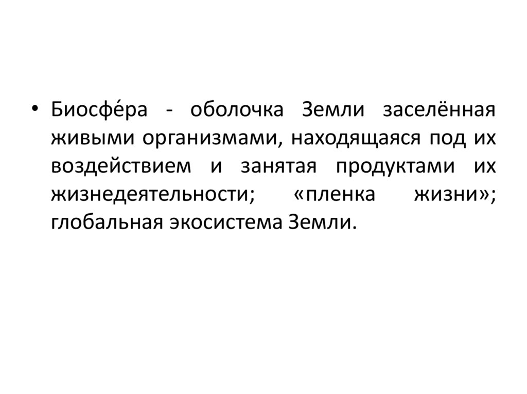 • Биосфе́ра - оболочка Земли заселённаяживыми организмами, находящаяся под их