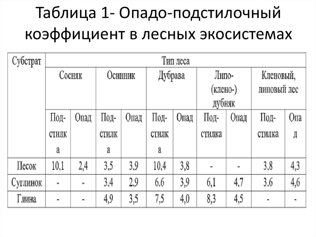 Таблица 1- Опадо-подстилочныйкоэффициент в лесных экосистемах