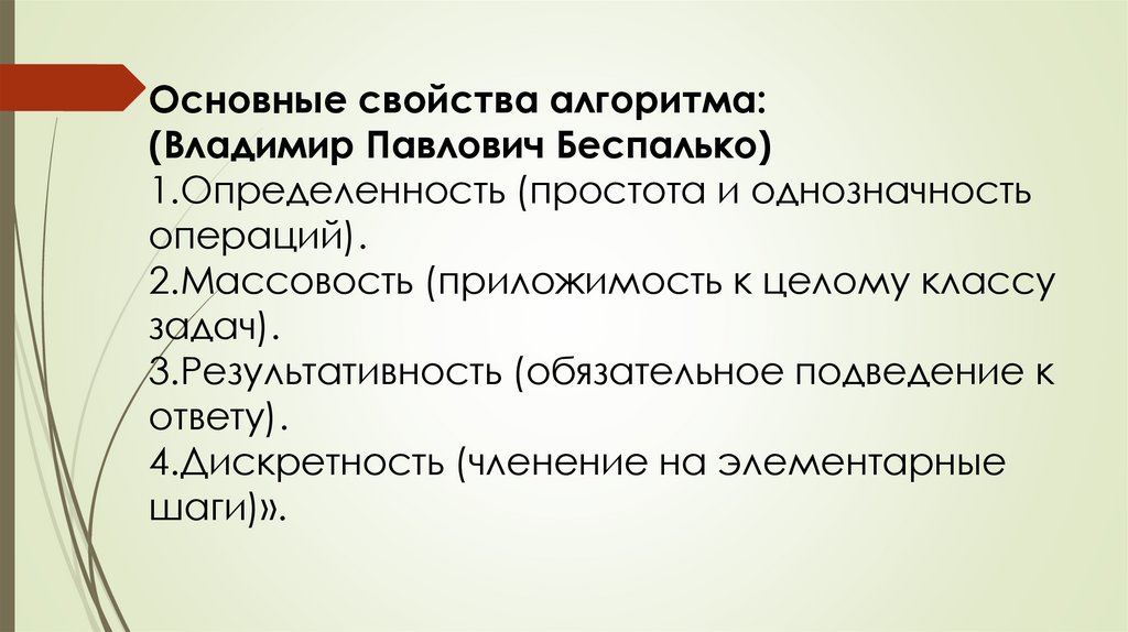 Основные свойства алгоритма:(Владимир Павлович Беспалько)