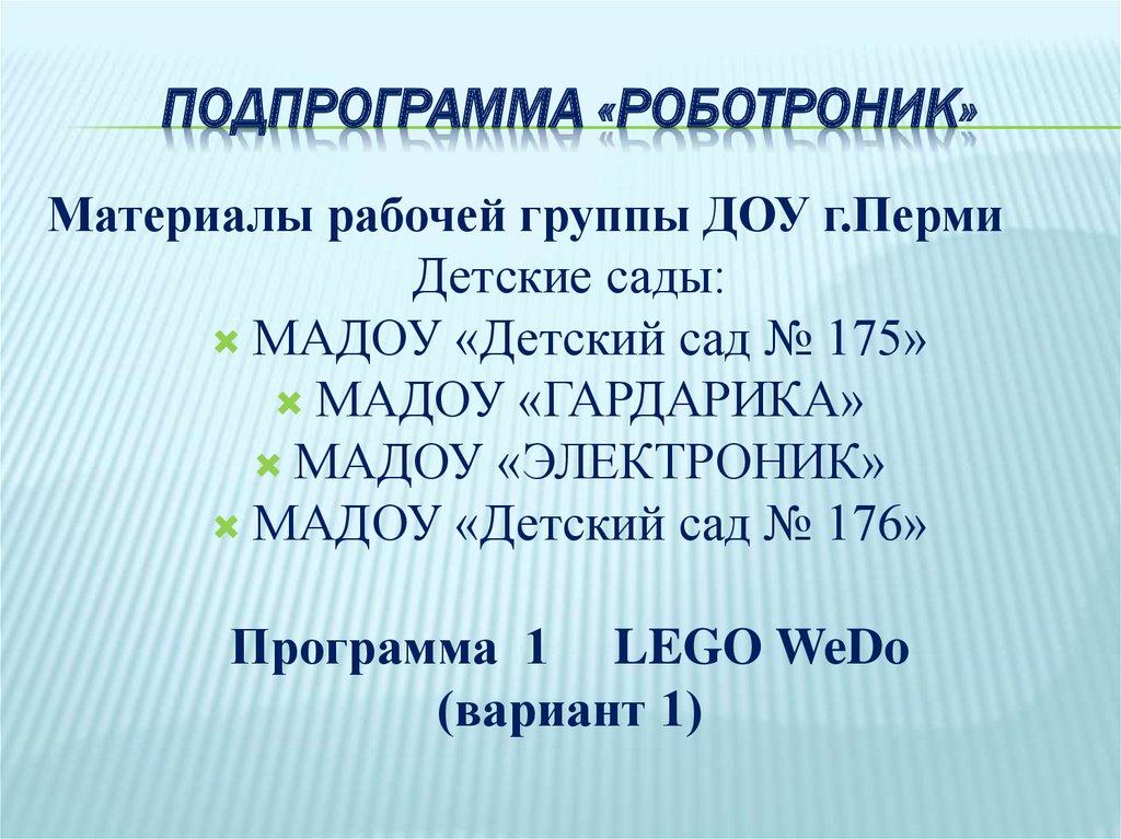 Подпрограмма «роботроник». Материалы рабочей группы ДОУ г. Перми