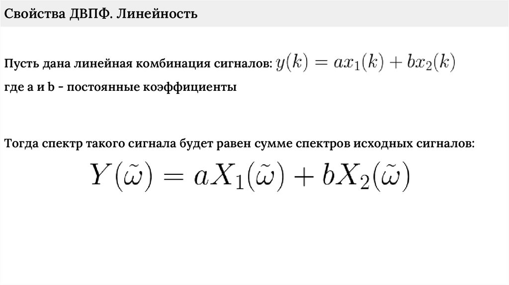 Свойства ДВПФ. ЛинейностьПусть дана линейная комбинация сигналов: