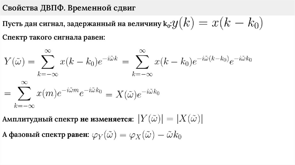 Свойства ДВПФ. Временной сдвигПусть дан сигнал, задержанный на величину k0:
