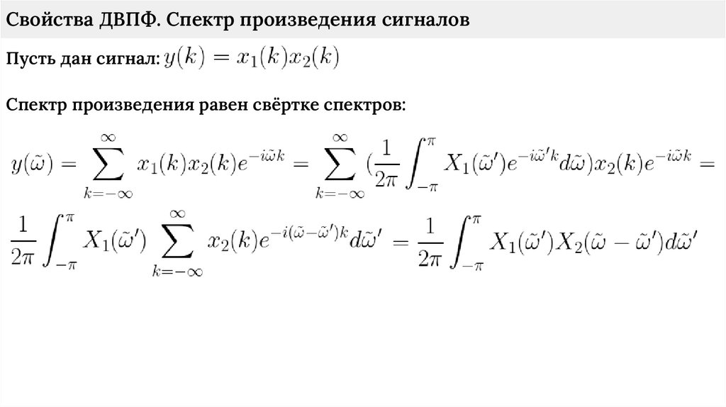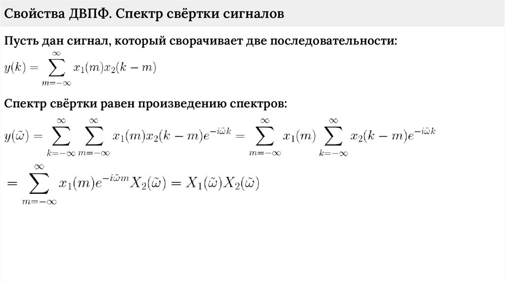 Свойства ДВПФ. Спектр свёртки сигналовПусть дан сигнал, который сворачивает две последовательности: