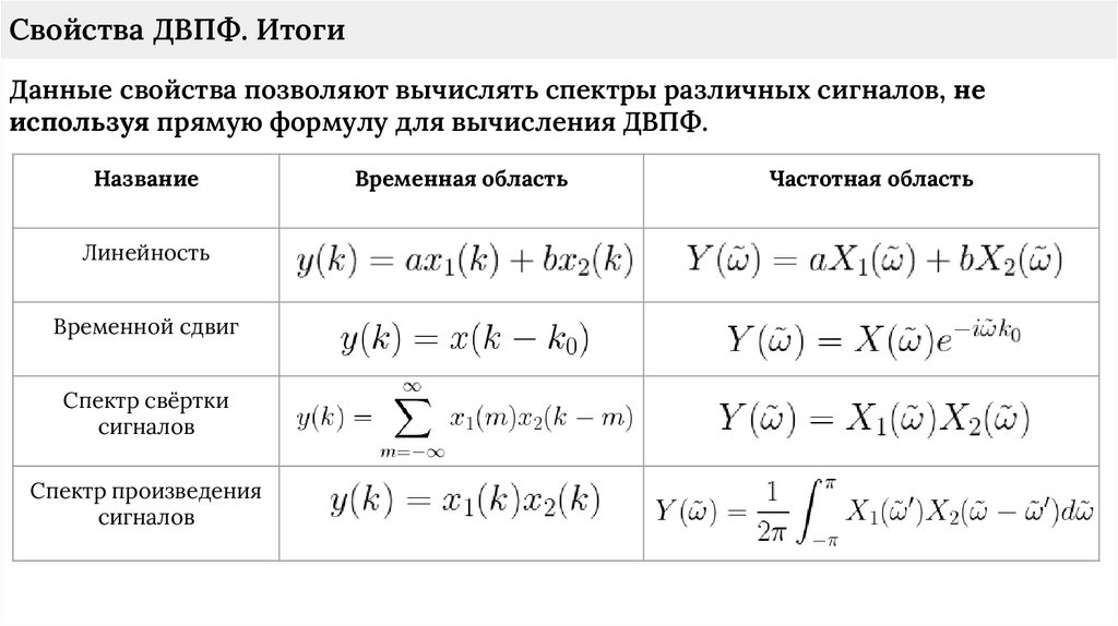 Свойства ДВПФ. ИтогиДанные свойства позволяют вычислять спектры различных сигналов, не