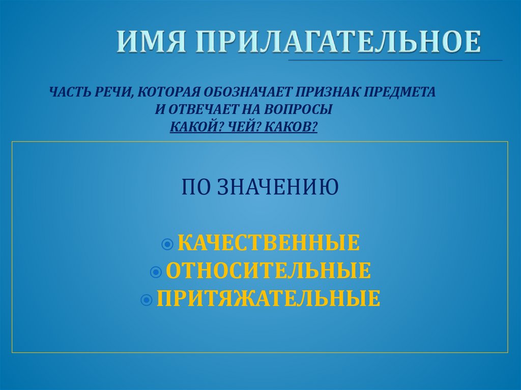 ЧАСТЬ РЕЧИ, КОТОРАЯ ОБОЗНАЧАЕТ ПРИЗНАК ПРЕДМЕТАИ ОТВЕЧАЕТ НА ВОПРОСЫ