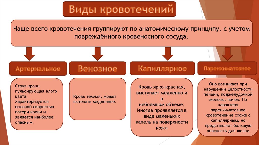 Чаще всего кровотечения группируют по анатомическому принципу, с учетомповреждённого кровеносного сосуда.