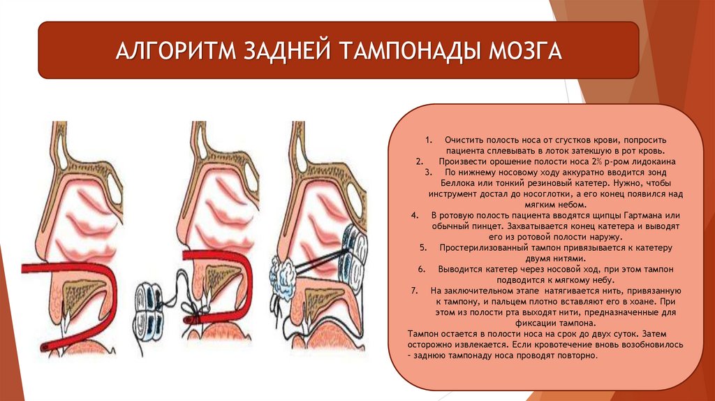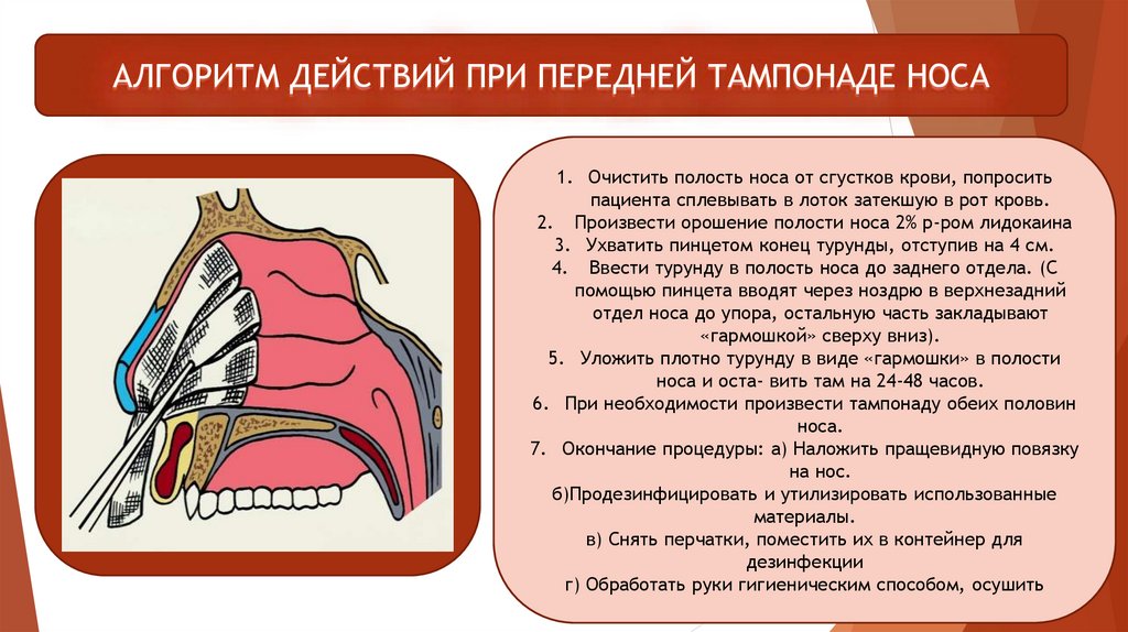 АЛГОРИТМ ДЕЙСТВИЙ ПРИ ПЕРЕДНЕЙ ТАМПОНАДЕ НОСА1. Очистить полость носа от сгустков крови, попросить