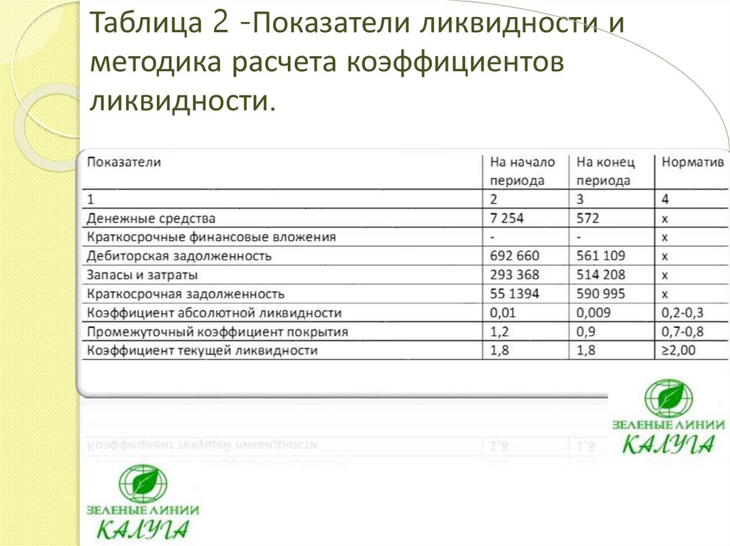 Таблица 2 -Показатели ликвидности иметодика расчета коэффициентов
