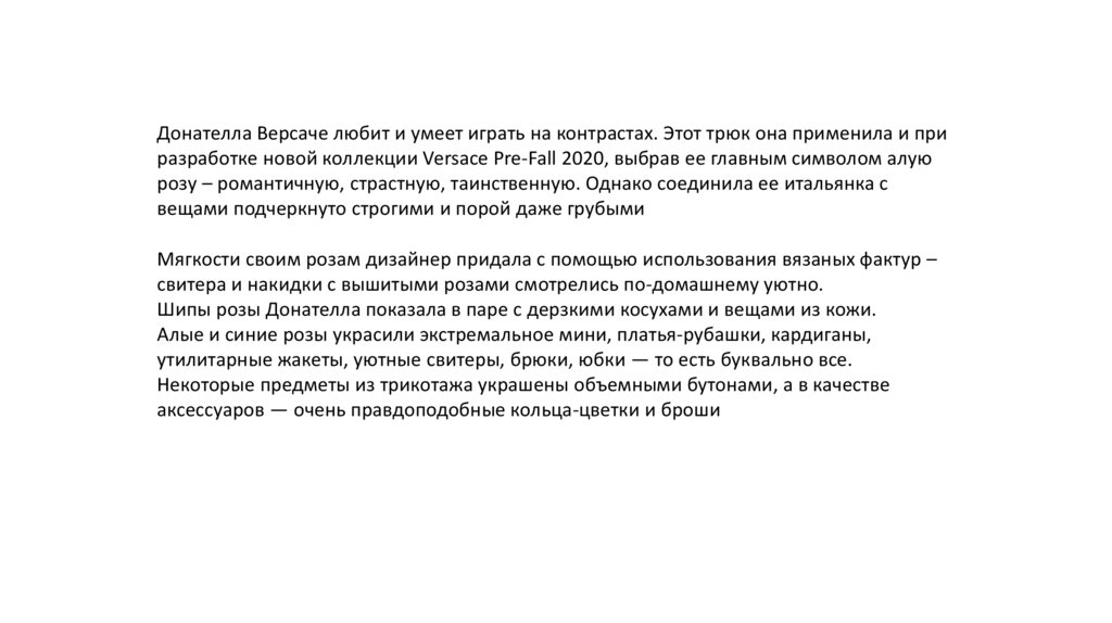 Донателла Версаче любит и умеет играть на контрастах. Этот трюк она применила и приразработке новой коллекции Versace Pre-Fall 2020, выбрав ее главным символом алую