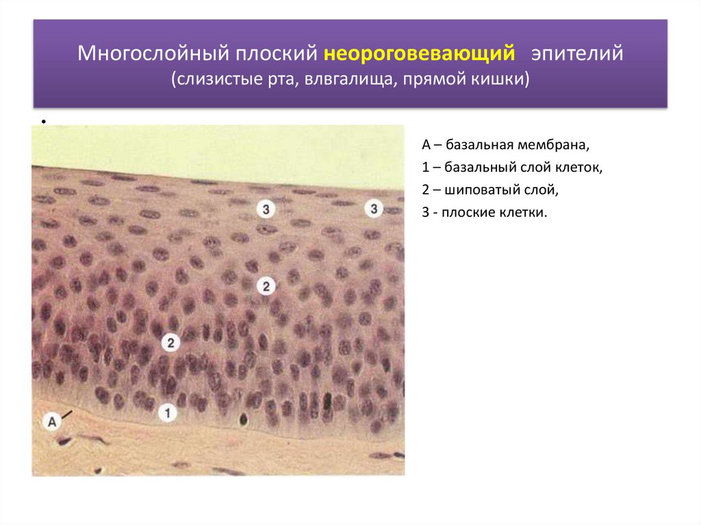 Многослойный плоский неороговевающий эпителий(слизистые рта, влвгалища, прямой кишки)