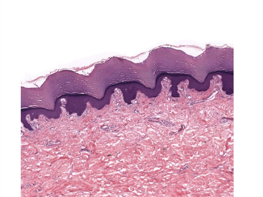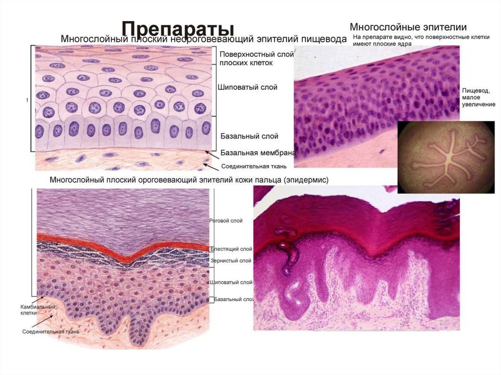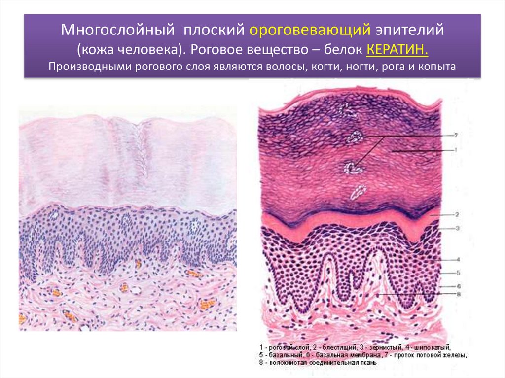 Многослойный плоский ороговевающий эпителий(кожа человека). Роговое вещество – белок КЕРАТИН.