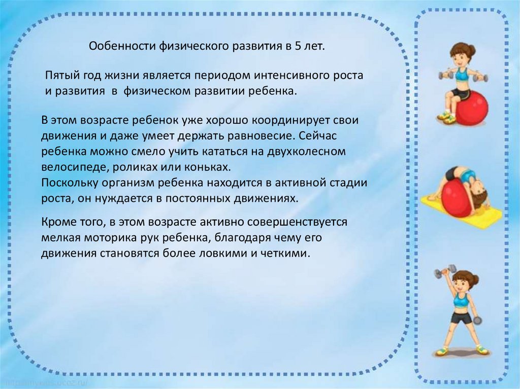 Ообенности физического развития в 5 лет.Пятый год жизни является периодом интенсивного роста