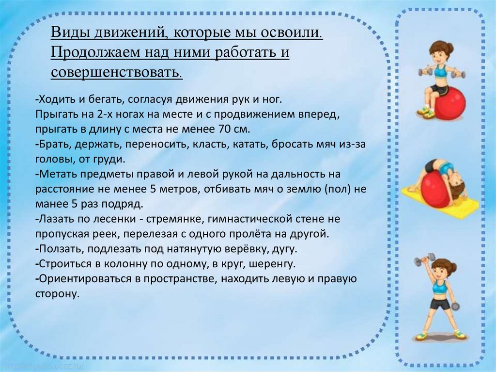 Виды движений, которые мы освоили.Продолжаем над ними работать и