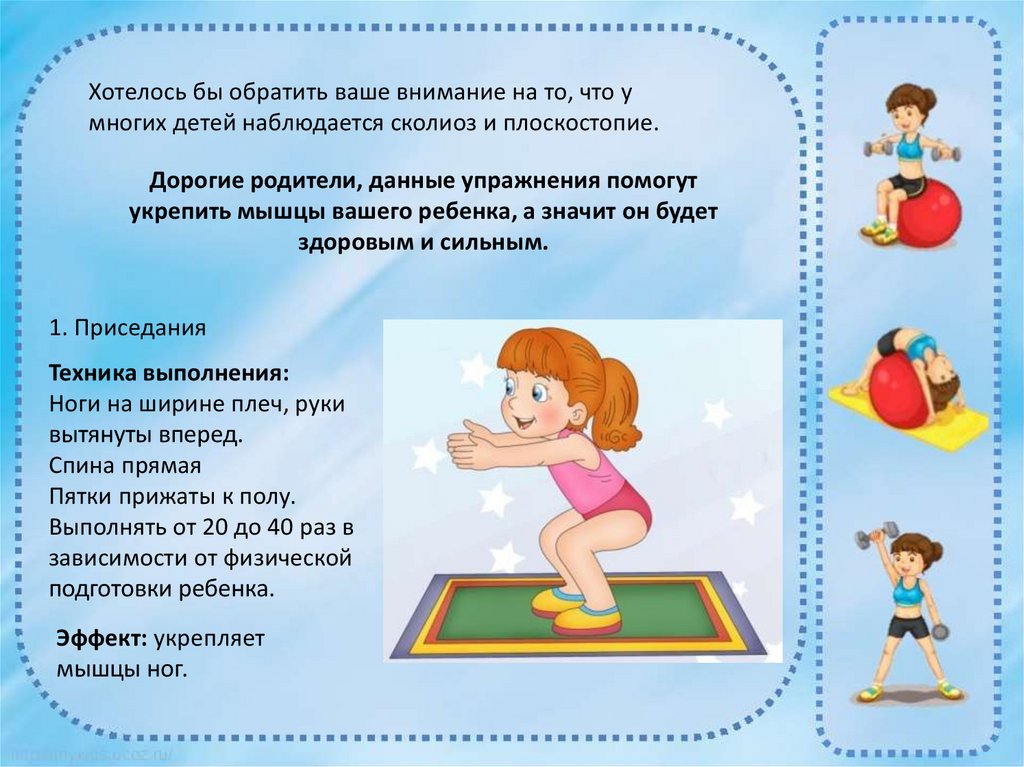 Хотелось бы обратить ваше внимание на то, что умногих детей наблюдается сколиоз и плоскостопие.