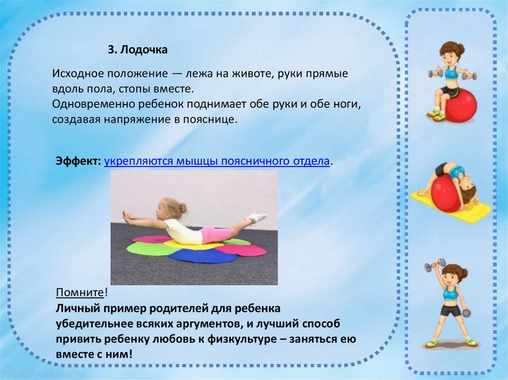 3. ЛодочкаИсходное положение — лежа на животе, руки прямые