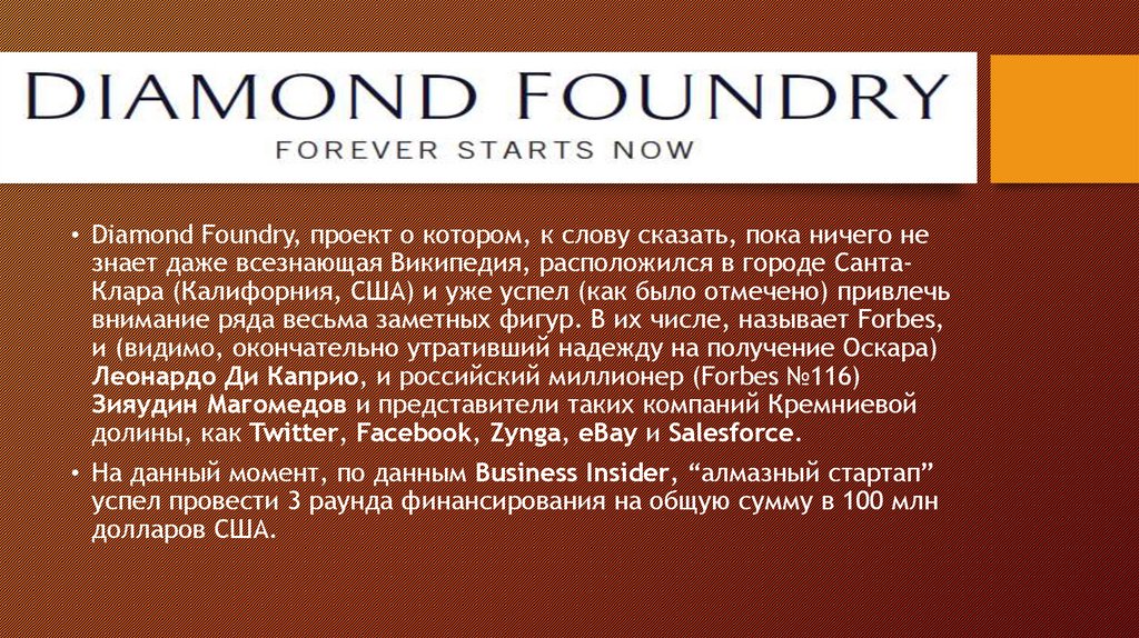 • Diamond Foundry, проект о котором, к слову сказать, пока ничего незнает даже всезнающая Википедия, расположился в городе СантаКлара (Калифорния, США) и уже успел (как было отмечено) привлечь