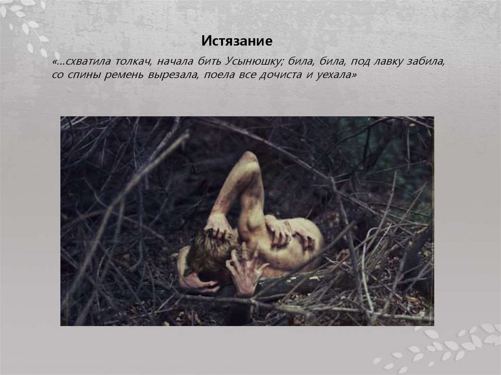 Истязание«…схватила толкач, начала бить Усынюшку; била, била, под лавку забила,