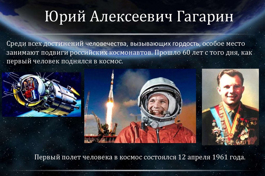 Юрий Алексеевич ГагаринСреди всех достижений человечества, вызывающих гордость, особое место