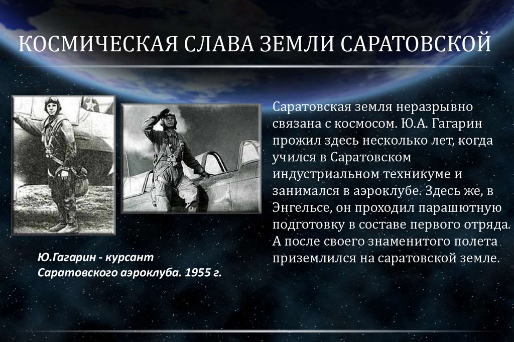 КОСМИЧЕСКАЯ СЛАВА ЗЕМЛИ САРАТОВСКОЙЮ.Гагарин - курсант