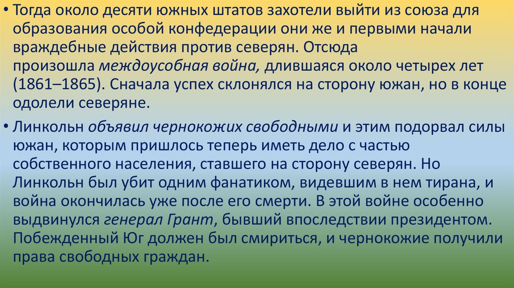 • Тогда около десяти южных штатов захотели выйти из союза дляобразования особой конфедерации они же и первыми начали