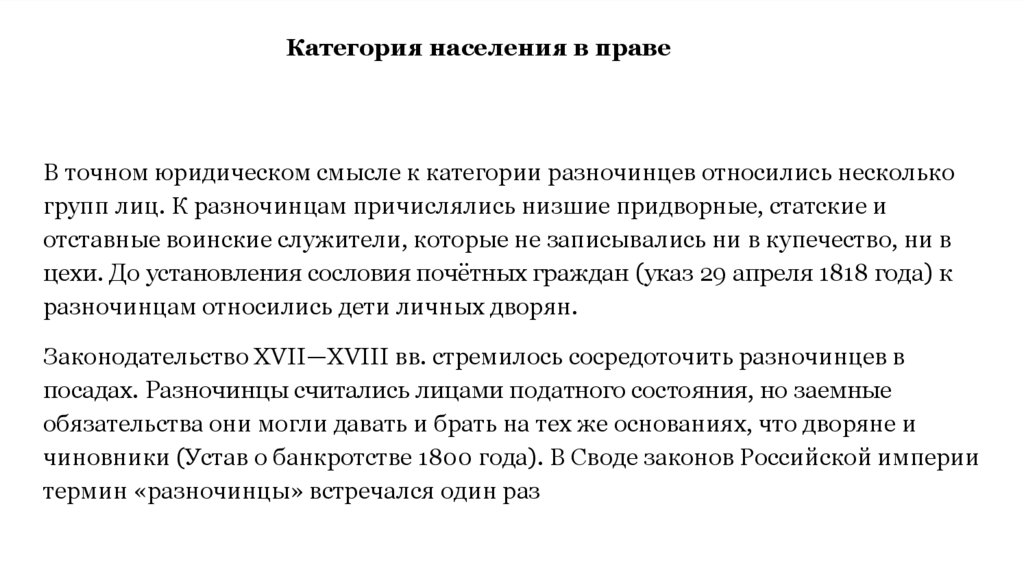 Категория населения в правеВ точном юридическом смысле к категории разночинцев относились несколько