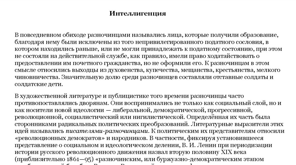 ИнтеллигенцияВ повседневном обиходе разночинцами назывались лица, которые получили образование,
