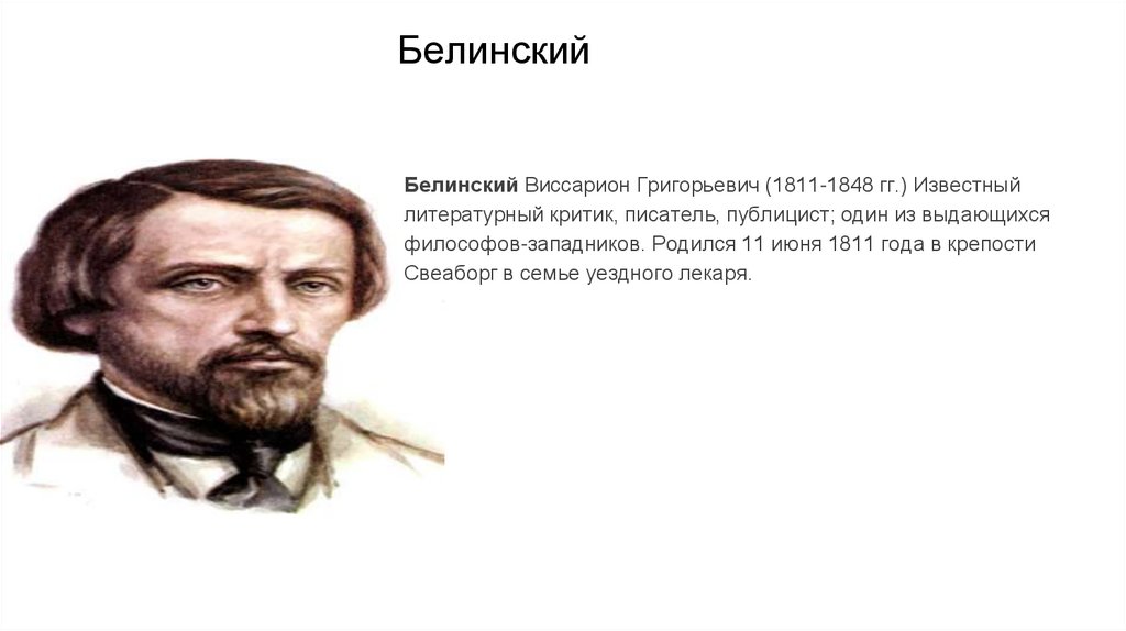 БелинскийБелинский Виссарион Григорьевич (1811-1848 гг.) Известный