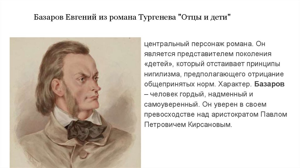 Базаров Евгений из романа Тургенева "Отцы и дети"центральный персонаж романа. Он