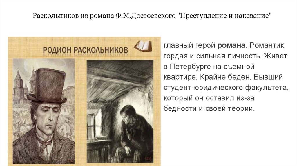 Раскольников из романа Ф.М.Достоевского "Преступление и наказание"главный герой романа. Романтик,
