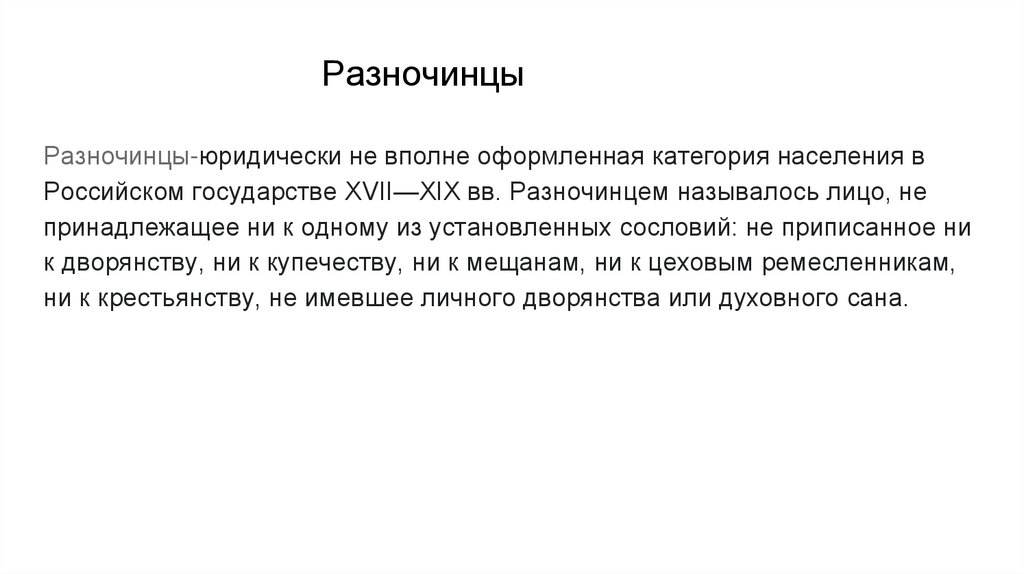 РазночинцыРазночинцы-юридически не вполне оформленная категория населения в