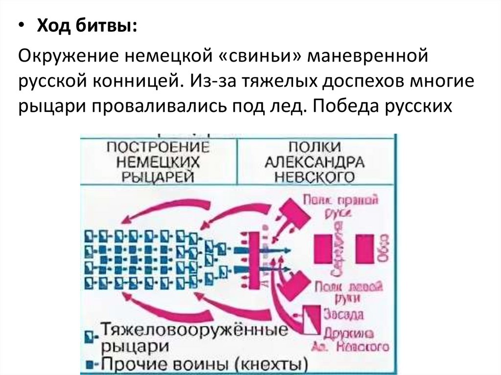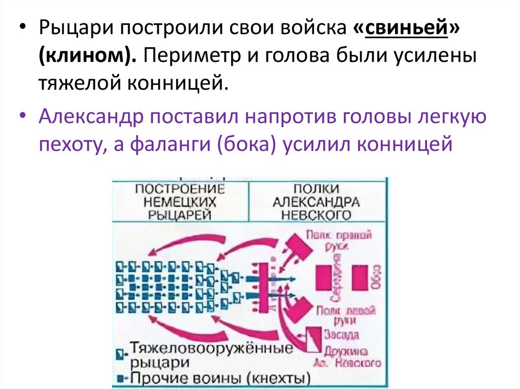 • Рыцари построили свои войска «свиньей»(клином). Периметр и голова были усилены