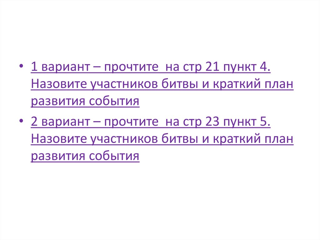 • 1 вариант – прочтите на стр 21 пункт 4.Назовите участников битвы и краткий план