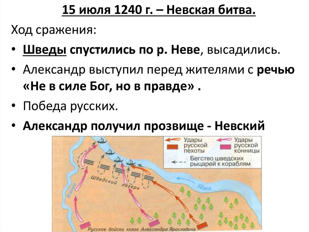 15 июля 1240 г. – Невская битва.Ход сражения: