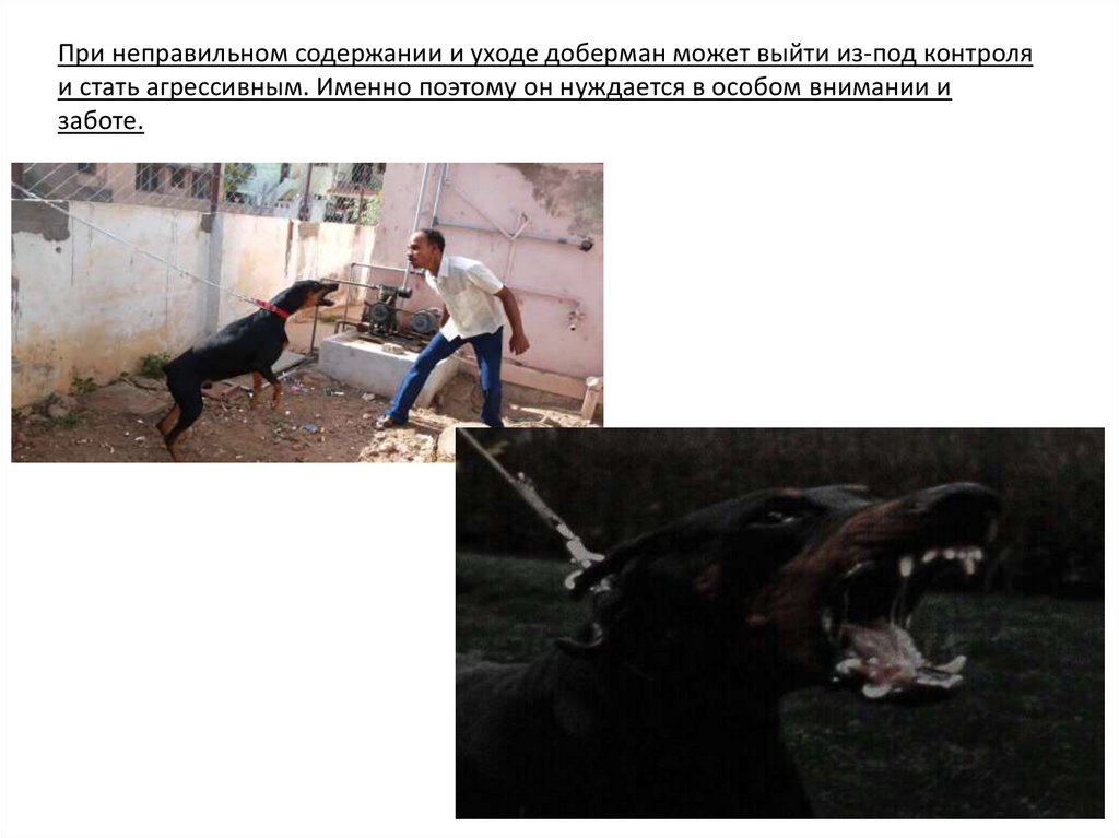 При неправильном содержании и уходе доберман может выйти из-под контроляи стать агрессивным. Именно поэтому он нуждается в особом внимании и