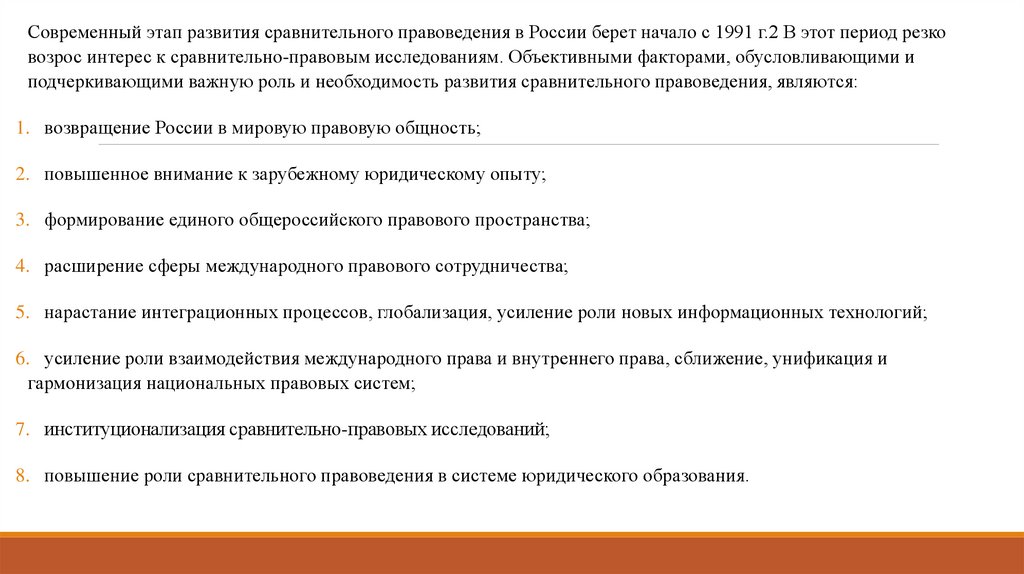 Современный этап развития сравнительного правоведения в России берет начало с 1991 г.2 В этот период резковозрос интерес к сравнительно-правовым исследованиям. Объективными факторами, обусловливающими и