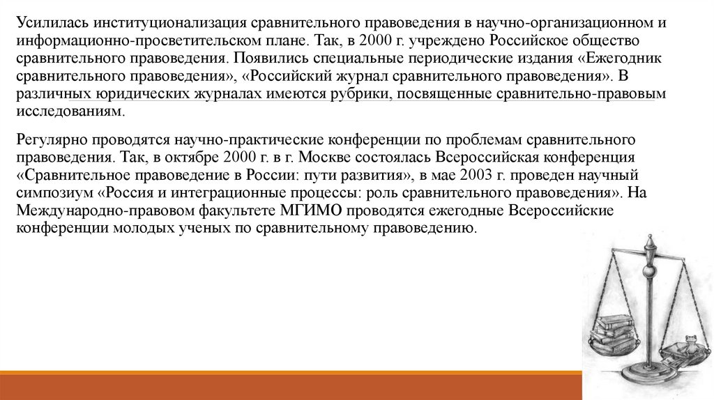 Усилилась институционализация сравнительного правоведения в научно-организационном иинформационно-просветительском плане. Так, в 2000 г. учреждено Российское общество