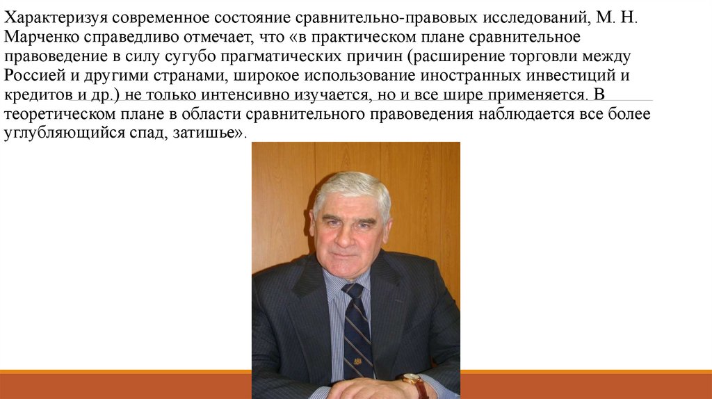 Характеризуя современное состояние сравнительно-правовых исследований, М. Н.Марченко справедливо отмечает, что «в практическом плане сравнительное