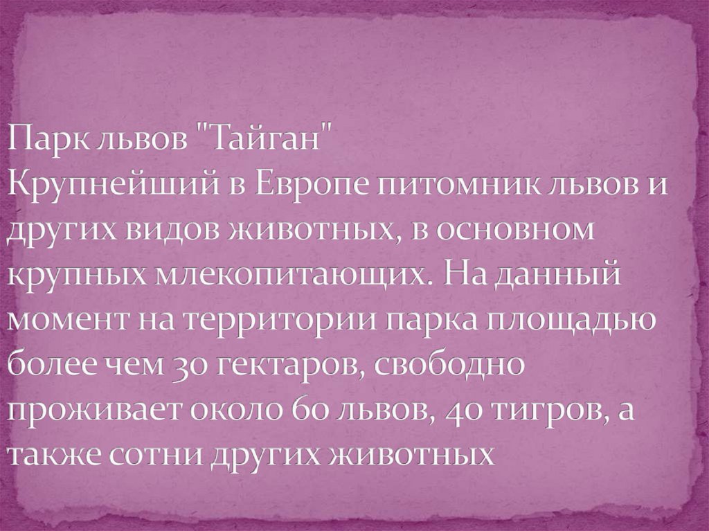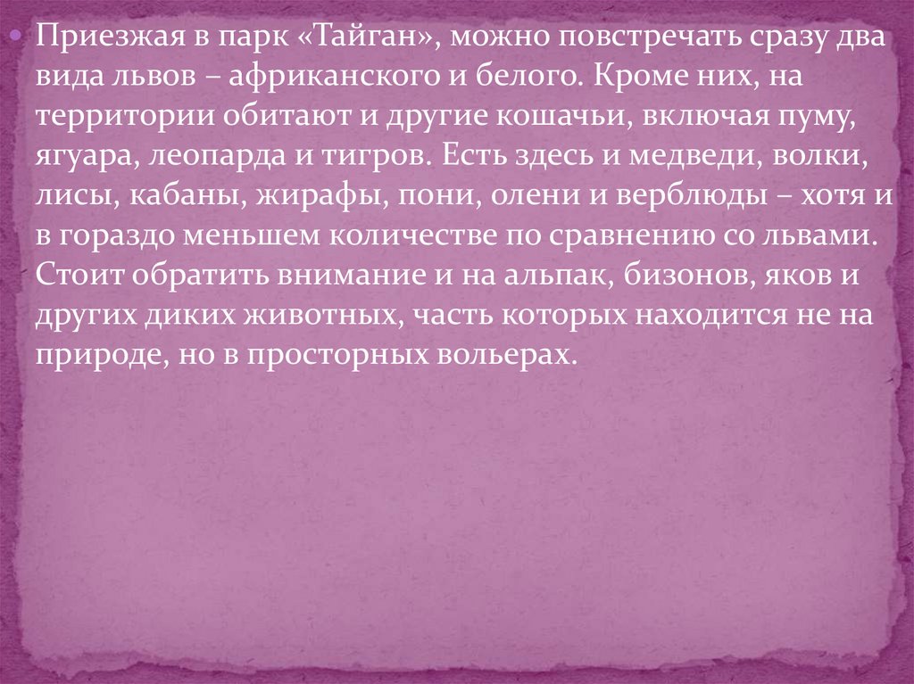 Приезжая в парк «Тайган», можно повстречать сразу двавида львов – африканского и белого. Кроме них, на