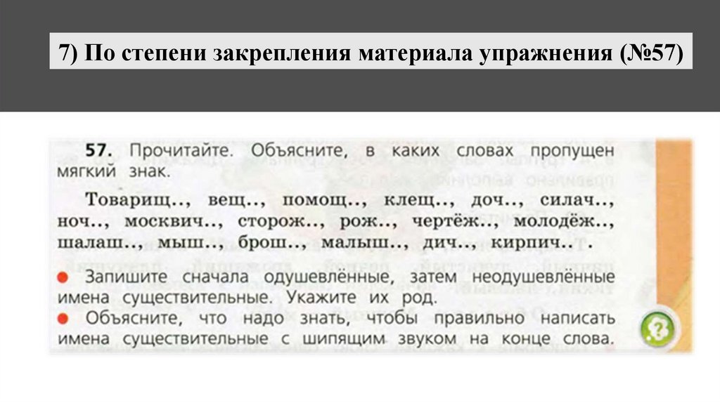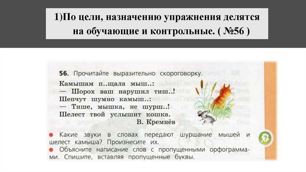 1)По цели, назначению упражнения делятсяна обучающие и контрольные. ( №56 )