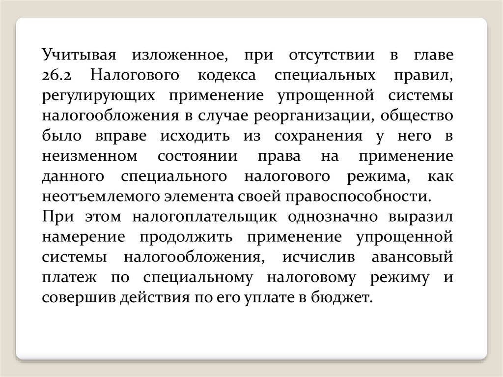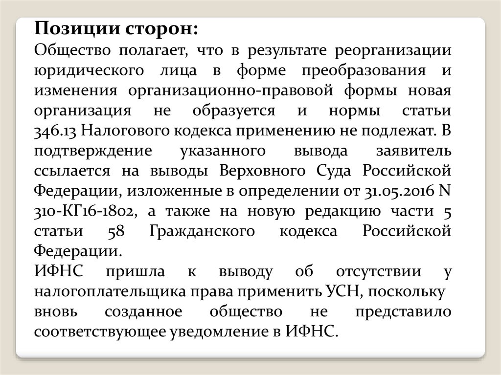Позиции сторон:Общество полагает, что в результате реорганизации